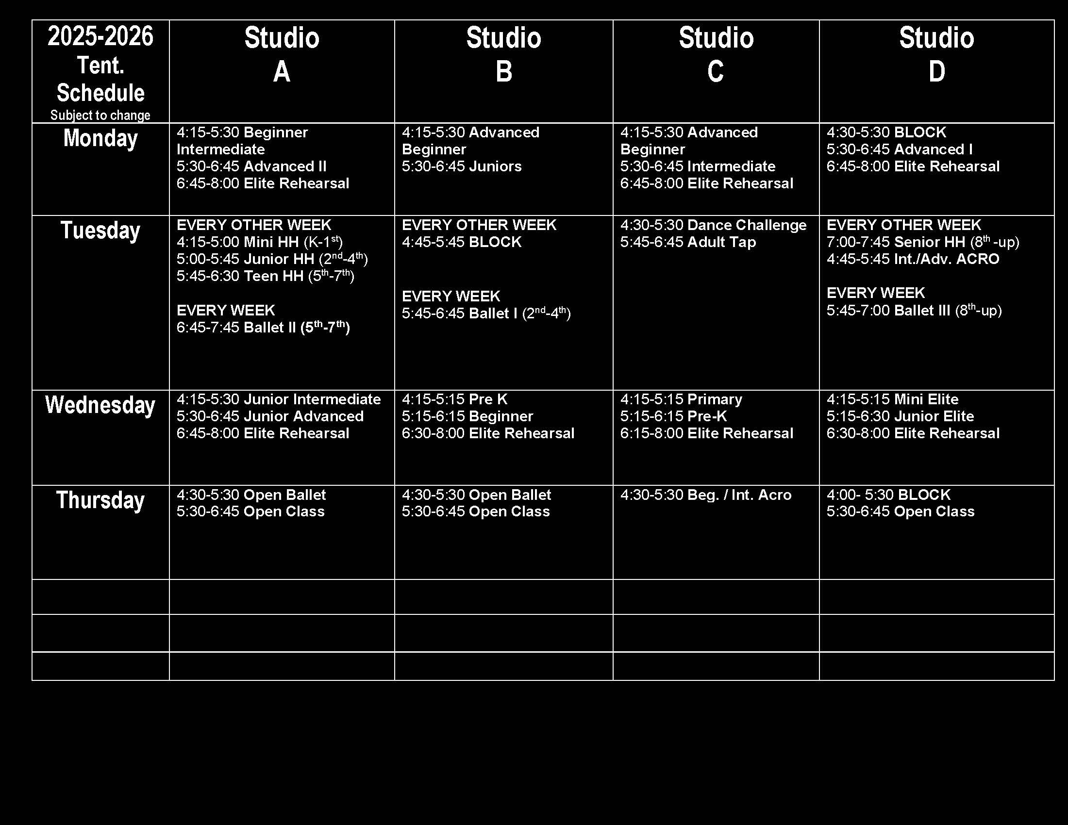 Subjects include tap, jazz, lyrical/contemporary, and acrobats